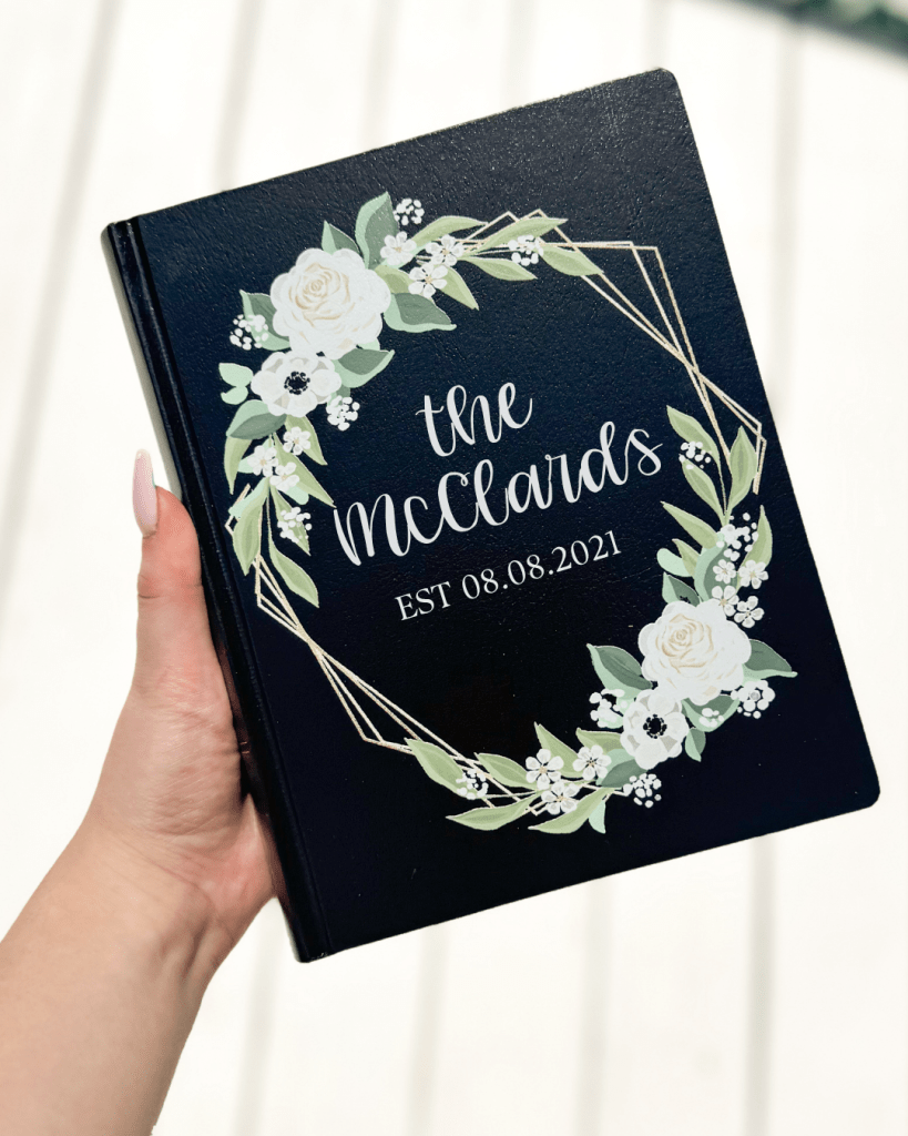 A hand-painted floral journaling Bible designed as a wedding guest book and family heirloom. Customize with your last name and date for a one-of-a-kind keepsake.
