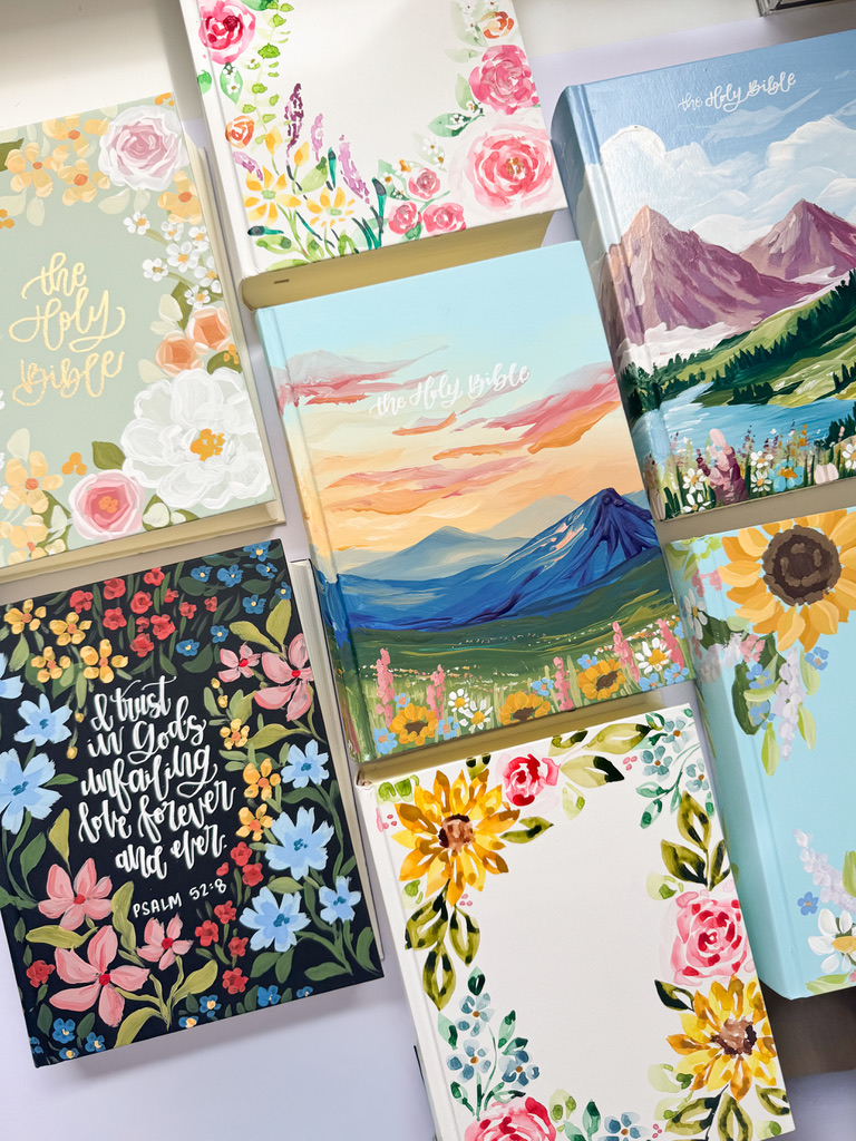 Create a one-of-a-kind keepsake with our beautifully hand-painted Bibles, customized just for you! The price includes your choice of design and up to 15 words on both the front and back. Each Bible is sealed to ensure it stays beautiful for years to come and is crafted entirely to order.