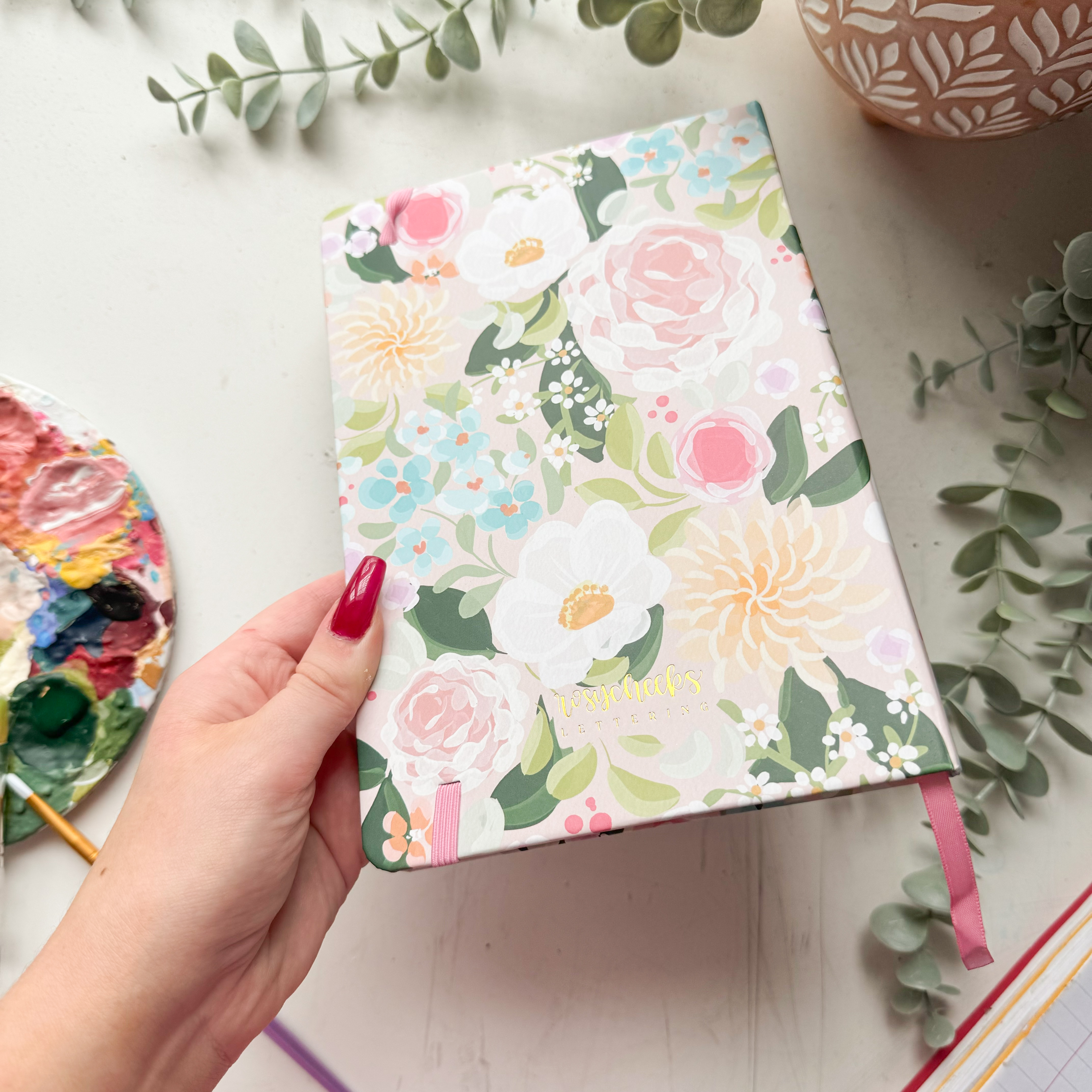 Elevate your journaling experience with this delightful A5 journal featuring a hand-drawn floral design and an inspiring hand-lettered Bible verse printed in elegant gold foiling. The 100 lined sheets (200 pages) of 80g paper provide ample space to record your thoughts, prayers, notes, and reflections. Thoughtfully designed with an elastic band closure and ribbon bookmark, this journal combines functionality with style. Measuring approximately 6 x 8 inches, it’s a perfect portable companion for church and daily travel.