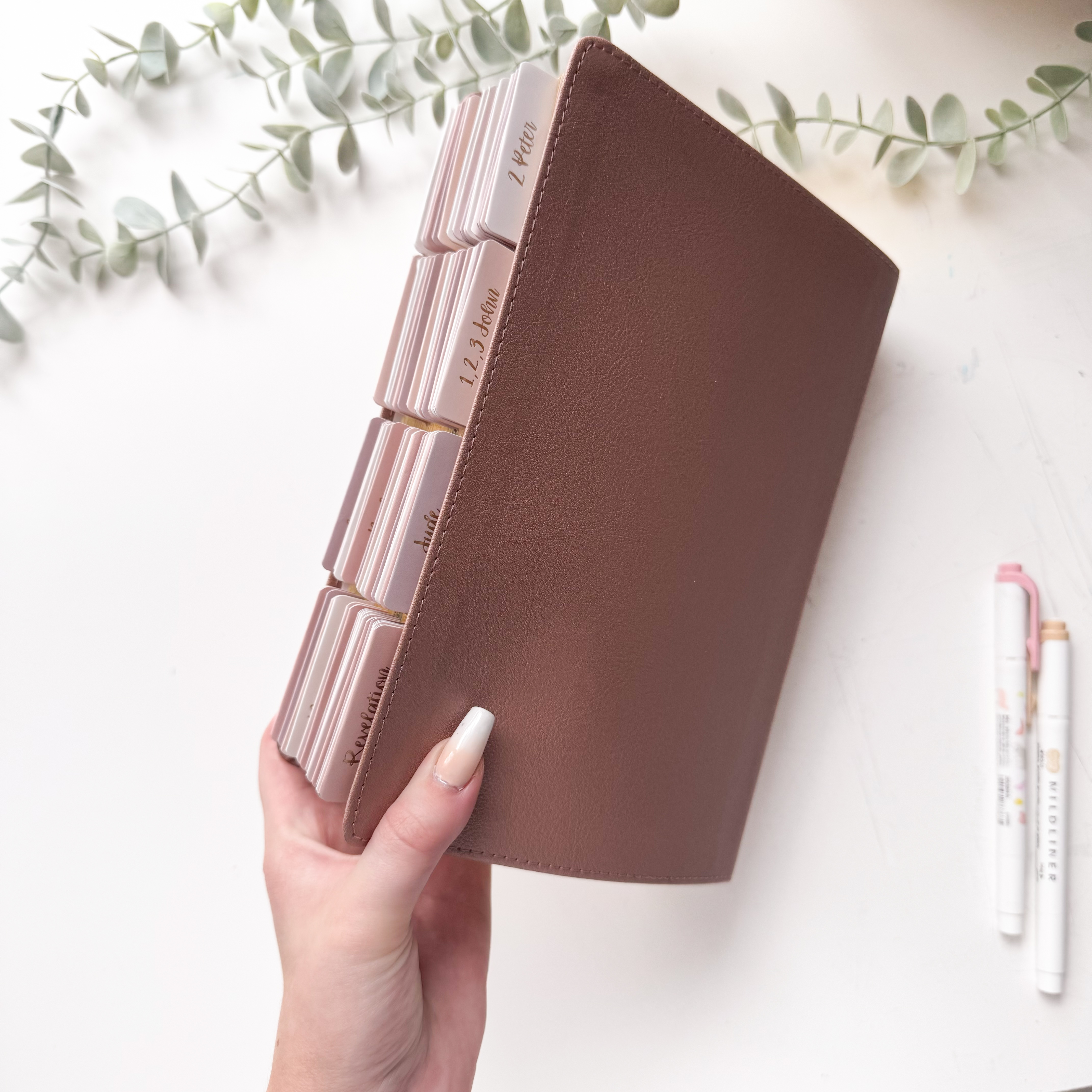 Tabs are handmade by Rosycheeks Lettering to match this Bible.